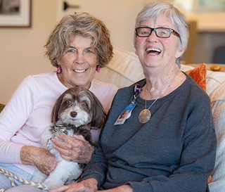 Pet therapy team Nancy Kelso and Coco Chanel visit patient Nancy Clark at the Dementia Care and Education Campus.